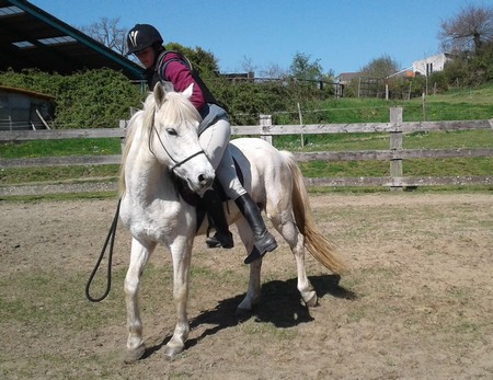 Elle a été longée sur le licol et débute sur le filet. Elle supporte la selle bien que les premières minutes elle ait été agacée (fouaille de la queue, oreilles couchées, lève un peu les fesses). Le montoir a été très facile et elle a été montée. Le cavalier ne la gêne aucunement. C’est une ponette gentille et qui comprend vite. Par contre elle a du caractère et discute ce qu’on lui demande.